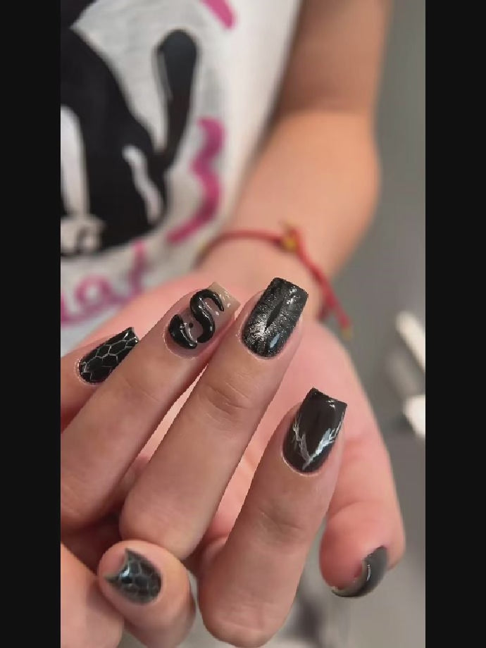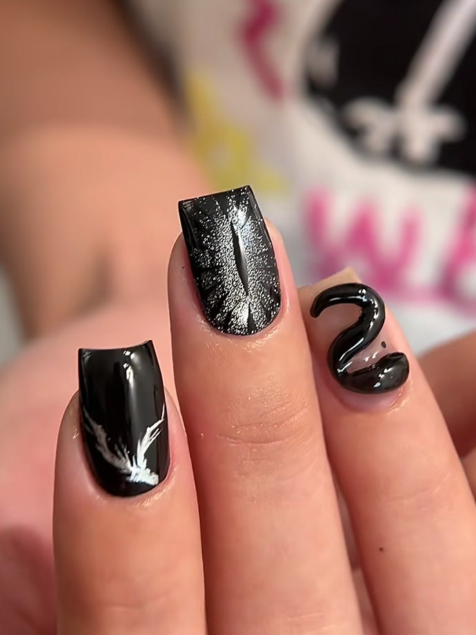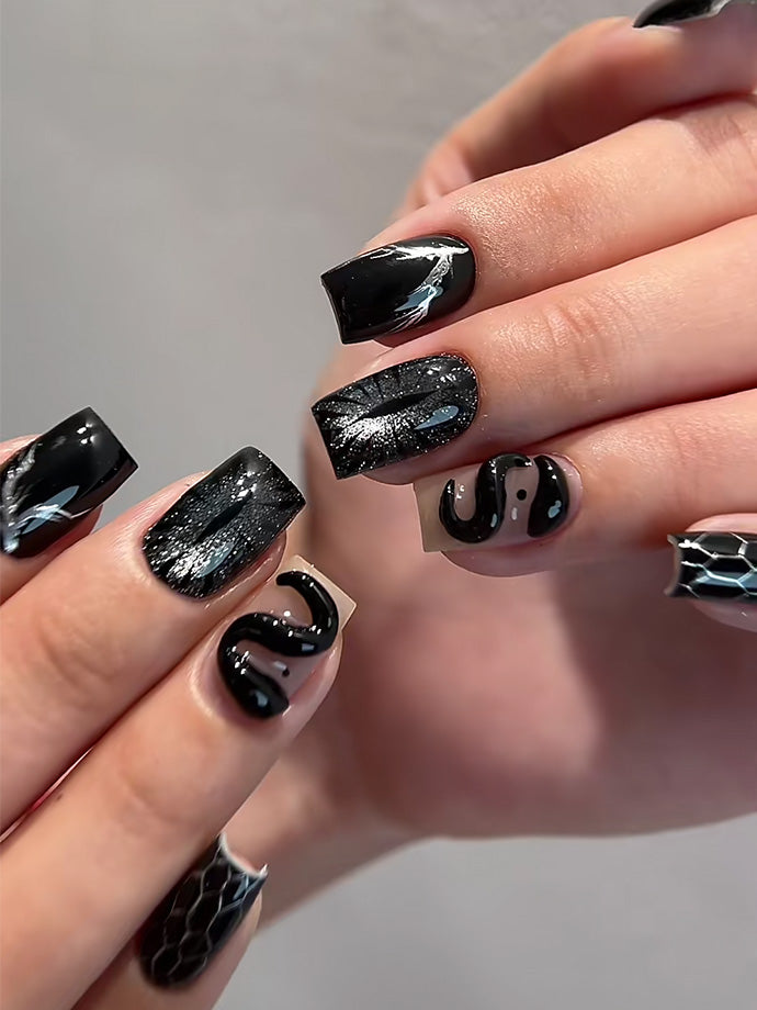 Each nail features a unique decorative texture, like snakeskin or starry gradients, making each one a piece of art.